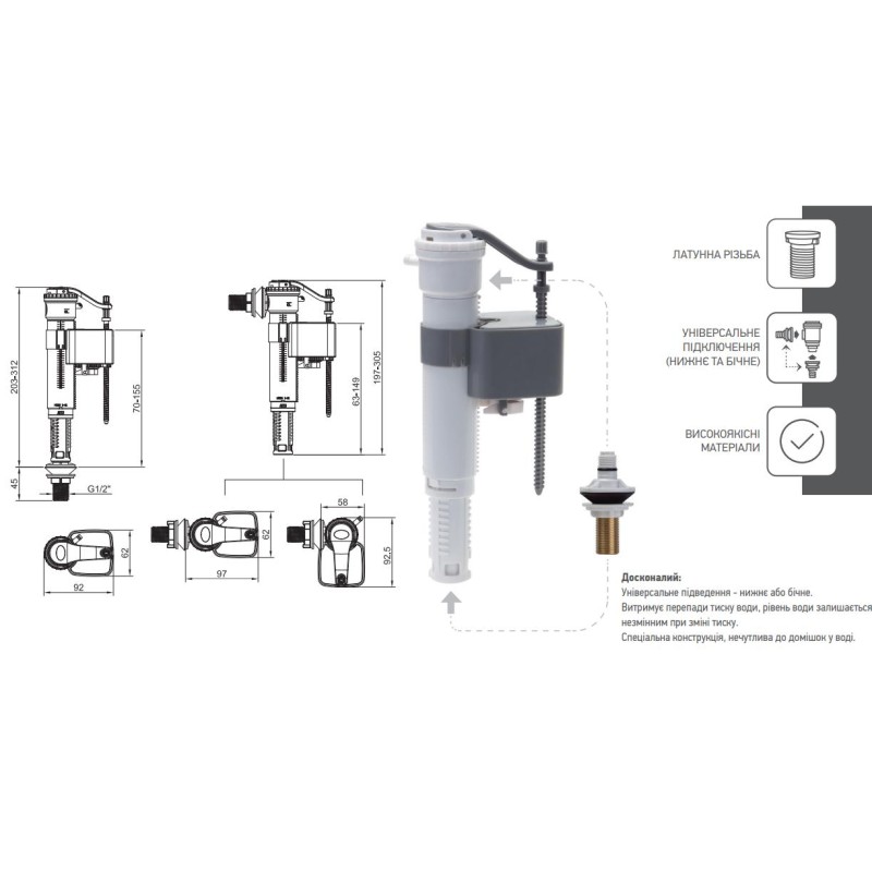 Для того, що спростити ваш вибір, KOER пропонує АРМАТУРУ НАПОВНЮВАЛЬНУ З УНІВЕРСАЛЬНИМ ПІДВЕДЕННЯМ KT-0101, що складається із двох універсальних механізмів, який підійдуть в обох випадках. Якісна водозабірна система витримує перепади тиску. Діаметр підключення: 1/2"