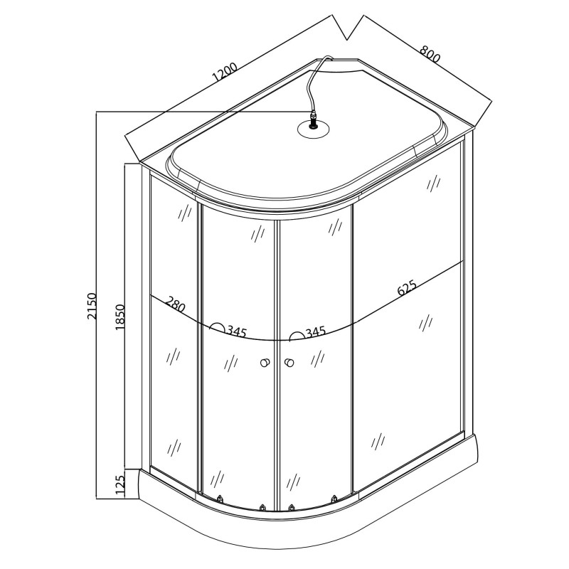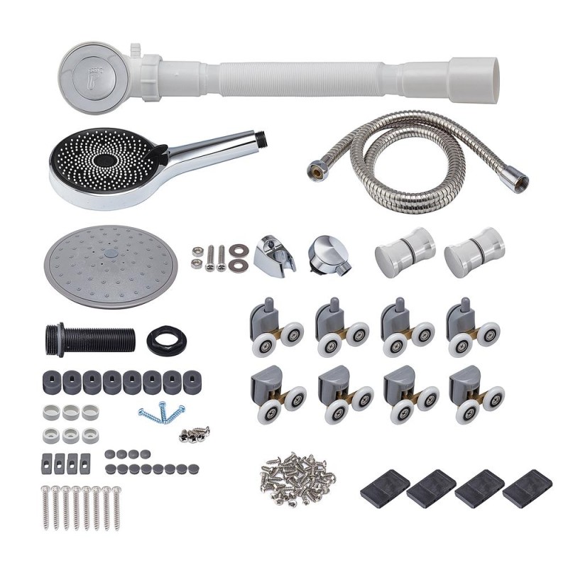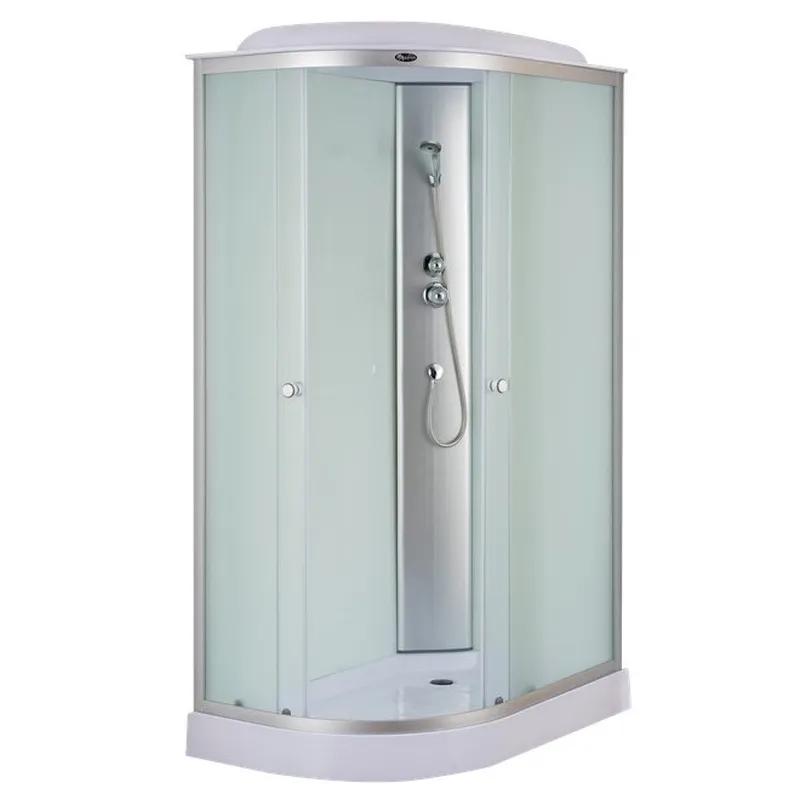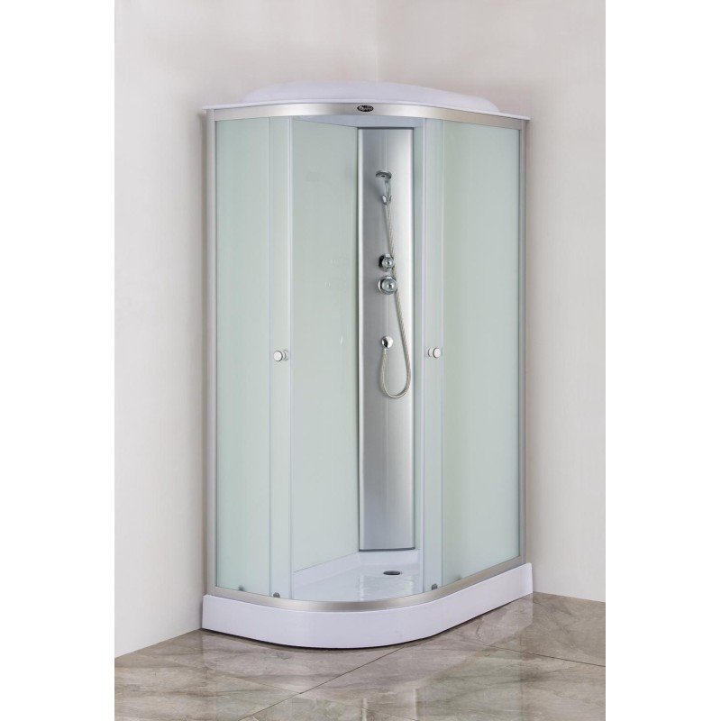 Укомплектована дахом із АBS-пластику, тому надійно захистить приміщення від зайвої вологи. Верхня лійка створює ефект тропічного душу. Ручний душ та штирькова ручка змішувача розміщені на центральній панелі, лійка душу має сучасну круглу форму та стильно доповнить дизайн виробу. Для зручності зберігання засобів гігієни на задній стінці передбачена скляна поличка.