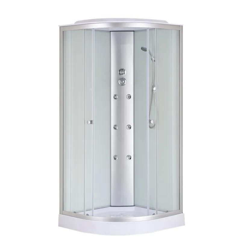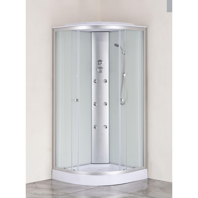 Моделі душових боксів STRONG з гідромасажем – це не просто душова кабіна, це цілий домашній спа-салон. Бокс SBH02 без електроніки, з низьким піддоном. Складається із двох округлих розсувних скляних дверей із загартованого скла 4 мм, двох фіксованих стінок, задніх стінок та хромованої центральної душової панелі. Скло кріпиться до стіни за допомогою регульованих сатинових профілів із алюмінію. Укомплектована дахом із АBS-пластику, тому надійно захистить приміщення від зайвої вологи. Вітражне скло - матове візерункове з білою задньою стінкою.