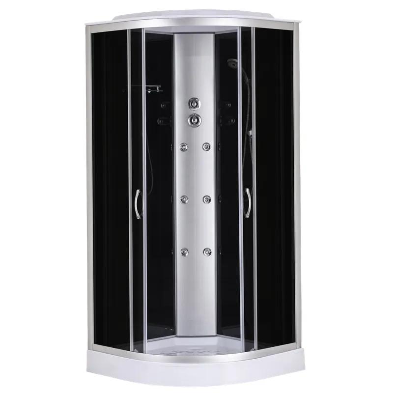 Моделі душових боксів STRONG з гідромасажем – це не просто душова кабіна, це цілий домашній спа-салон. Бокс SBH02 без електроніки, з низьким піддоном. Складається із двох округлих розсувних скляних дверей із загартованого скла 4 мм, двох фіксованих стінок, задніх стінок та хромованої центральної душової панелі. Скло кріпиться до стіни за допомогою регульованих сатинових профілів із алюмінію. Укомплектована дахом із АBS-пластику, тому надійно захистить приміщення від зайвої вологи. Вітражне скло - сіре тоноване (не плівка) з чорною задньою стінкою. Верхня лійка створює ефект тропічного душу. Гідромасажні форсунки горизонтально розпиляють воду, разом із штирьковою ручкою змішувача вони розташовані на центральній панелі. Ручний душ розміщений на задній стінці, лійка душу має сучасну круглу форму та стильно доповнить дизайн виробу. Для зручності зберігання засобів гігієни на задній стінці передбачена скляна поличка. Армований низький піддон витримає до 150кг, має регульовані ніжки, він комплектується посиленим сифоном Click-clack з брудозатримувачем (нажимна пробка), має вихід гофри 40/50мм. Має подвійні естетичні округлі ручки, зручні у користуванні. Регулюючі подвійні верхні і нижні ролики на підшипниках. Герметичність закриття забезпечується силіконовими магнітними ущільнювачами на краях дверей.