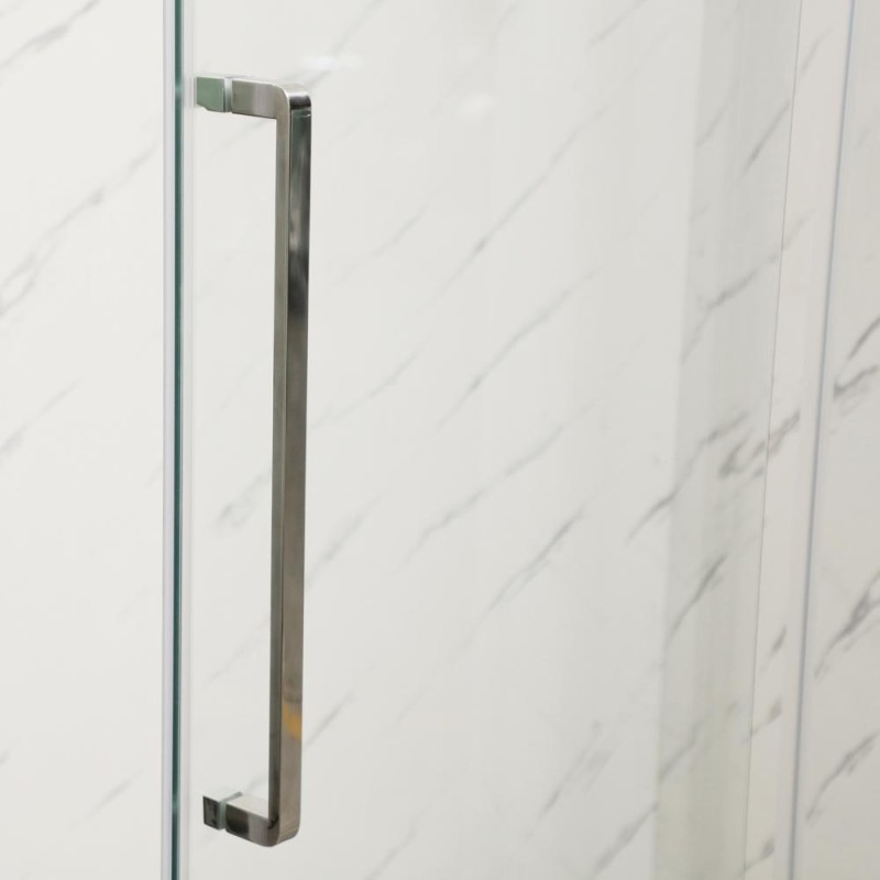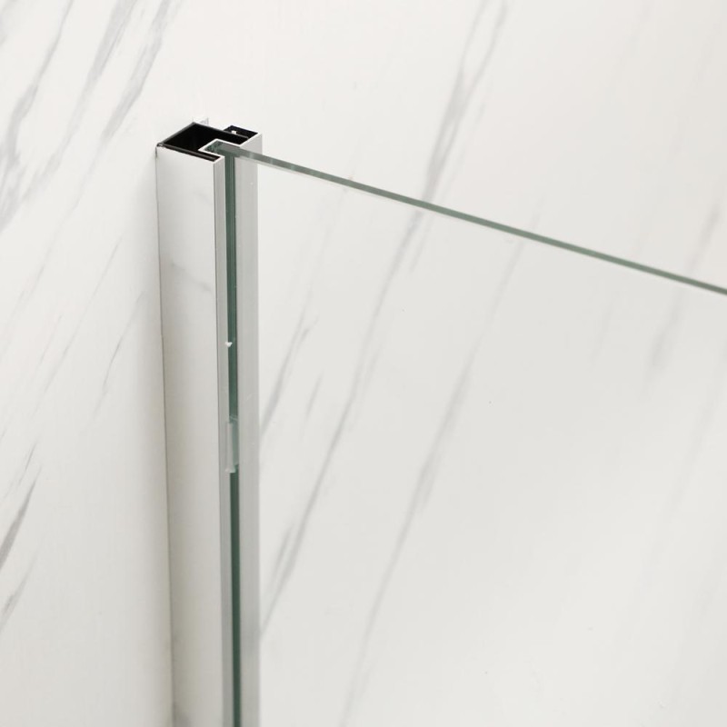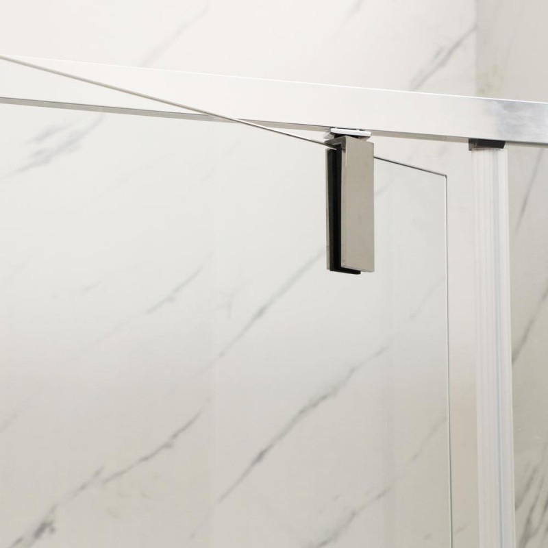 Душова кабіна складається із одних розпашних скляних дверей та двох фіксованих стінок, із регульованим профілем із хромованого алюмінію. Привабливий зовнішній вигляд дозволить втілити будь-які дизайнерські рішення та заощадити місце у санвузлі. Завіси із нержавіючої сталі надійні та стильні. Подовжена ручка із нержавіючої сталі додасть привабливості. Герметичність закриття забезпечується силіконовими магнітними ущільнювачами на краях дверей. Піддон до комплектації не входить.