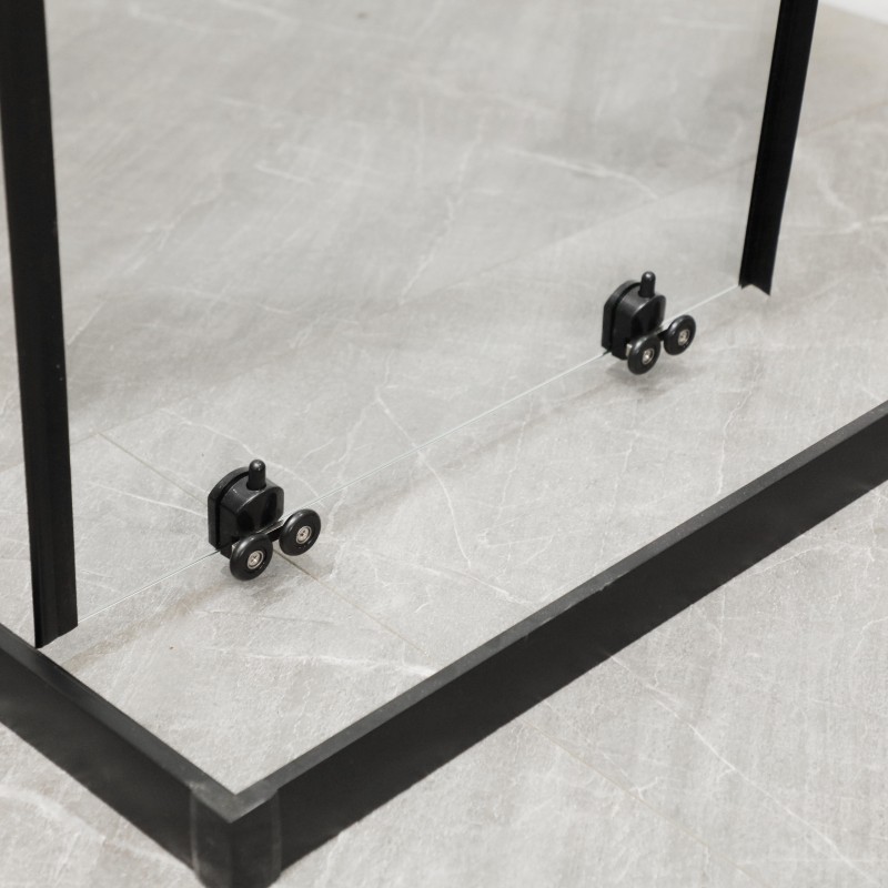 Душова кабіна складається із двох стильних розсувних скляних дверей та двох фіксованих стінок, з подвійним регульованим профілем із алюмінію. Привабливий зовнішній вигляд дозволить втілити будь-які дизайнерські рішення та заощадити місце у санвузлі. Регулюючі хромовані подвійні верхні і нижні ролики мають збільшений термін експлуатації. Герметичність закриття забезпечується силіконовими магнітними ущільнювачами на краях дверей. Піддон до комплектації не входить.