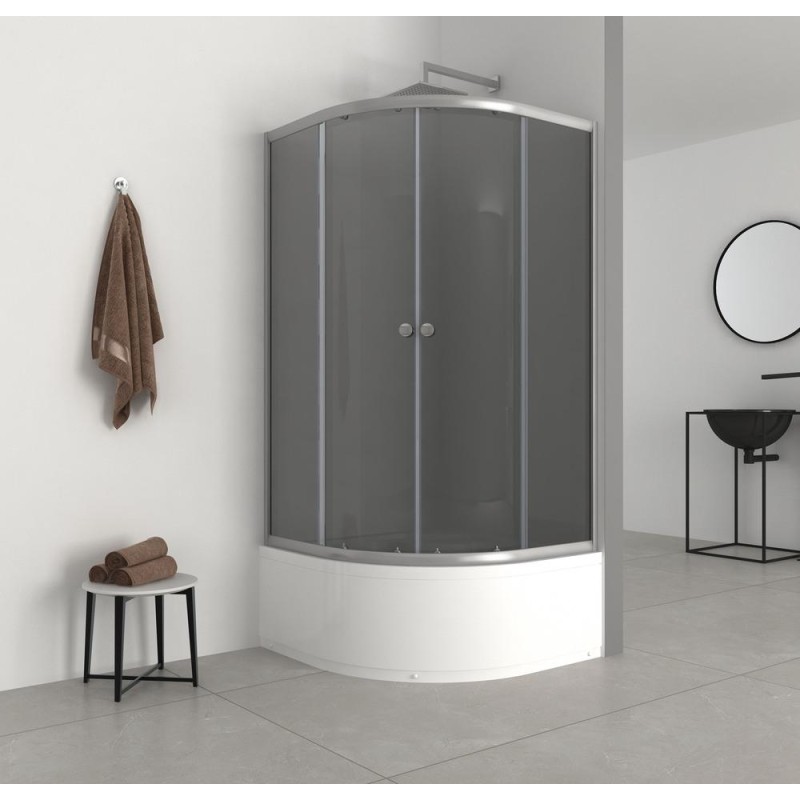 Колекція розсувних округлих кабін PLAIN має дизайн, що не піддається плину часу. Кабіна складається із двох округлих розсувних скляних дверей із загартованого скла товщиною 4 мм та двох фіксованих стінок. Укомплектована нівелюючим сатиновим профілем.