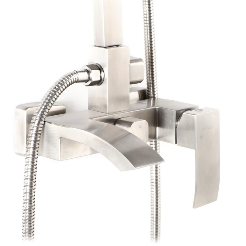 Особливості Розміри ручної лійки: 22х8 см. Розміри стельової лійки: 20х20 см. Довжина виливу від стіни: 19 см. Максимальна висота стійки 140 см. Мінімальна висота стійки 90 см.