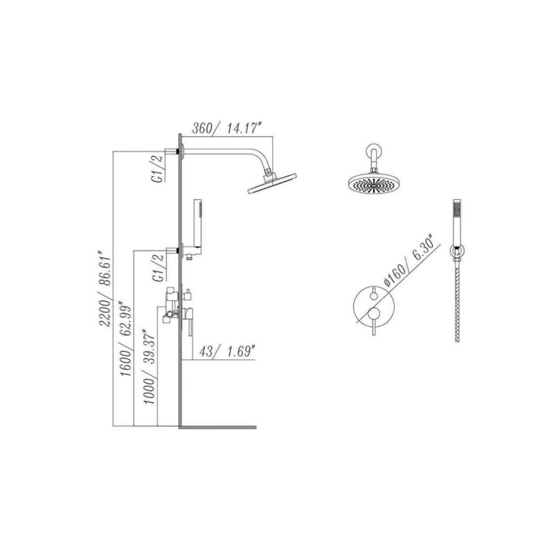 Душова система складається з верхнього душу, змішувача, ручного душу, душового шланга та тримача