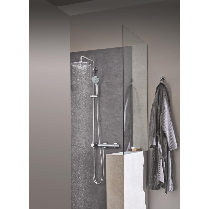 Душева система Grohe Euphoria System - ідеальне рішення для ванних кімнат з обмеженим простором. Колона має стійку, яка легко кріпиться до стіни та заощаджує дорогоцінні дюйми простору у ванній кімнаті. Grohe Euphoria System без змішувача має стильну хромовану поверхню та регулюється по висоті відповідно до потреб будь-якого користувача.