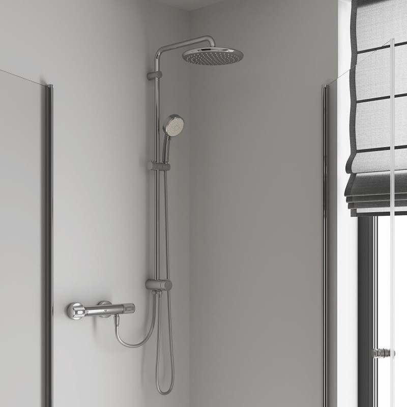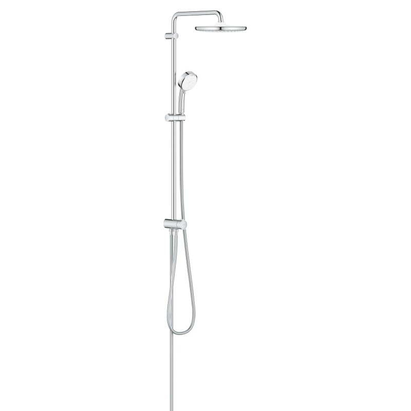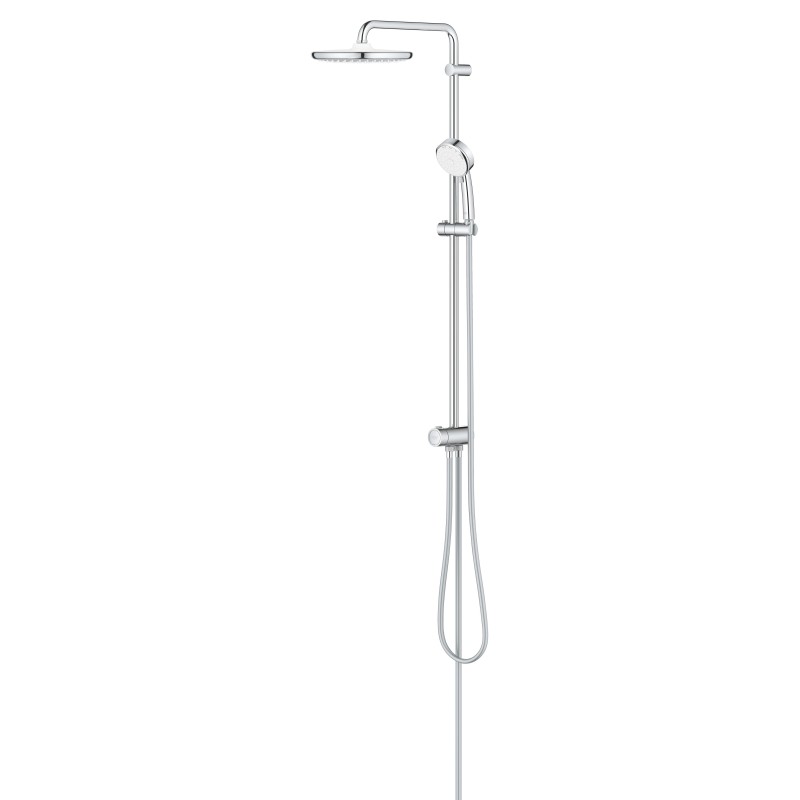Душева система Grohe New Tempesta Cosmop. System - ідеальне рішення для ванних кімнат з обмеженим простором. Колона має стійку, яка легко кріпиться до стіни та заощаджує дорогоцінні дюйми простору у ванній кімнаті. Grohe New Tempesta Cosmop. System без змішувача має стильну хромовану поверхню і регулюється по висоті відповідно до потреб будь-якого користувача.