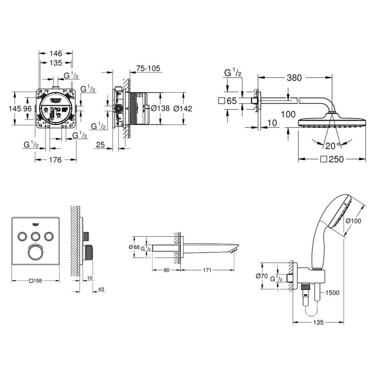 Душова система прихованого монтажу з термостатом Grohe Grohtherm SmartControl New Tempesta 250 (UA26415SC2)