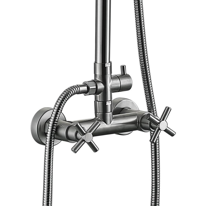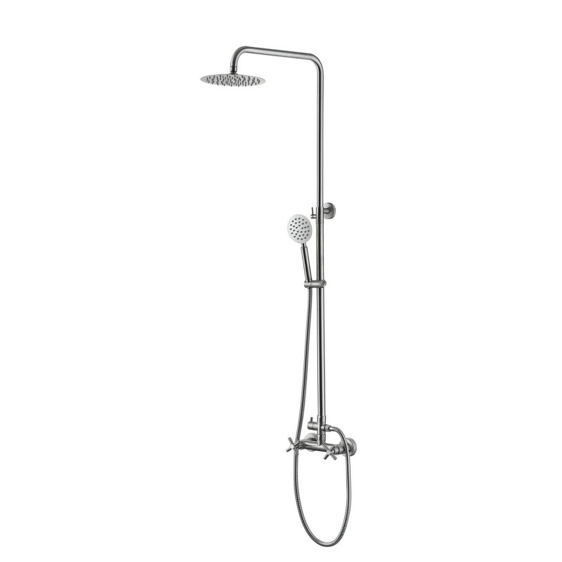 Система для душу Wezer VAL16B-10 з перемиканням на лійку та без виливу. Вона зроблена з нержавіючої сталі, має популярний зараз відтінок сатин. Між режимами перемикається дивертором. Стандартне рішення для всіх змішувачів для душа та ванни з подібною конструкцією. У деяких моделях можна також перемикати за допомогою змішувача, але його тут немає. Але є верхній душ великої площі. Здатний зімітувати відчуття дощу в тропіках. Не буде зайвою і ручна лійка. Для купання така стійка найкраще рішення. Вона бюджетна, компактна та надійна. Напір та температура регулюється вентилями.