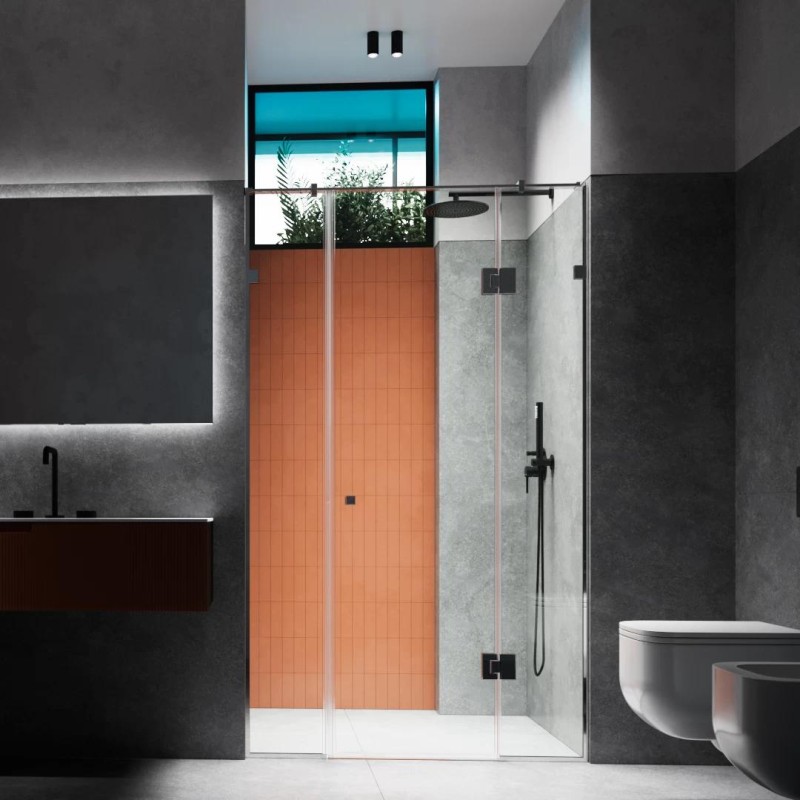 Рухомі дверцята розміщені посередині, тримаються на петлях і мають зручну ручку для відкривання. Вони можуть мати різні габарити, забарвлення фурнітури та вигляд скла. З обох боків від дверей розміщені нерухомі скляні стінки, які, насамперед, виконують роль стіни і дуже стильно виглядають у просторих санвузлах.