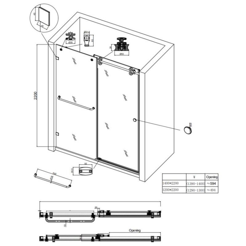 | Комплектація | Упаковка 1/1. Глухе скло, скляні двері, настінний затискач, верхня рейка, нижня водонепроникна планка, 2 ручки, верхні ролики, система нижніх повзунів, комплект кріпильних деталей, набір ущільнювачів, заглушки. |