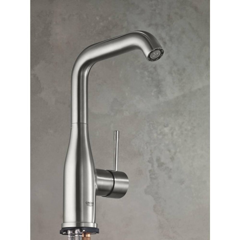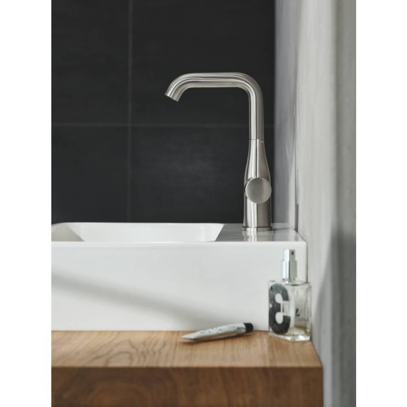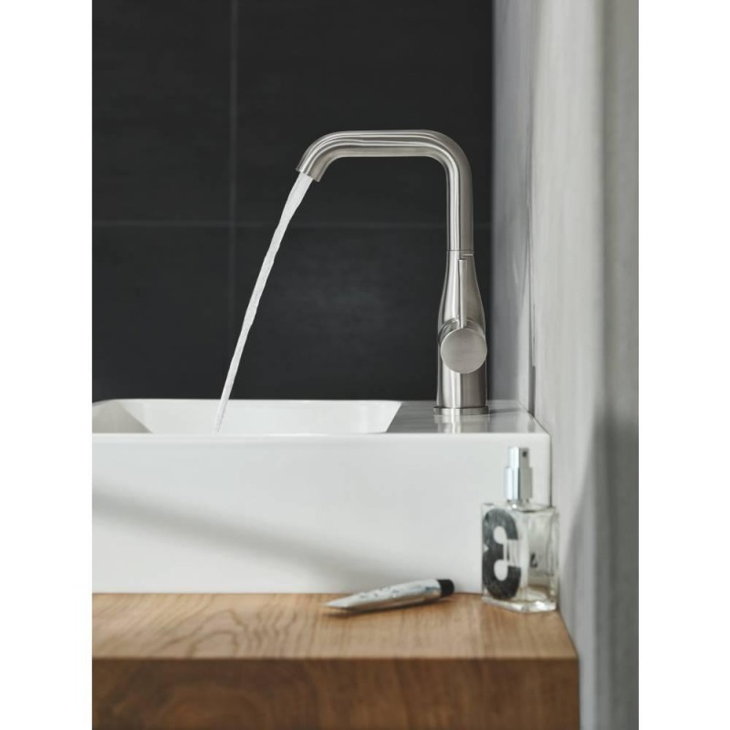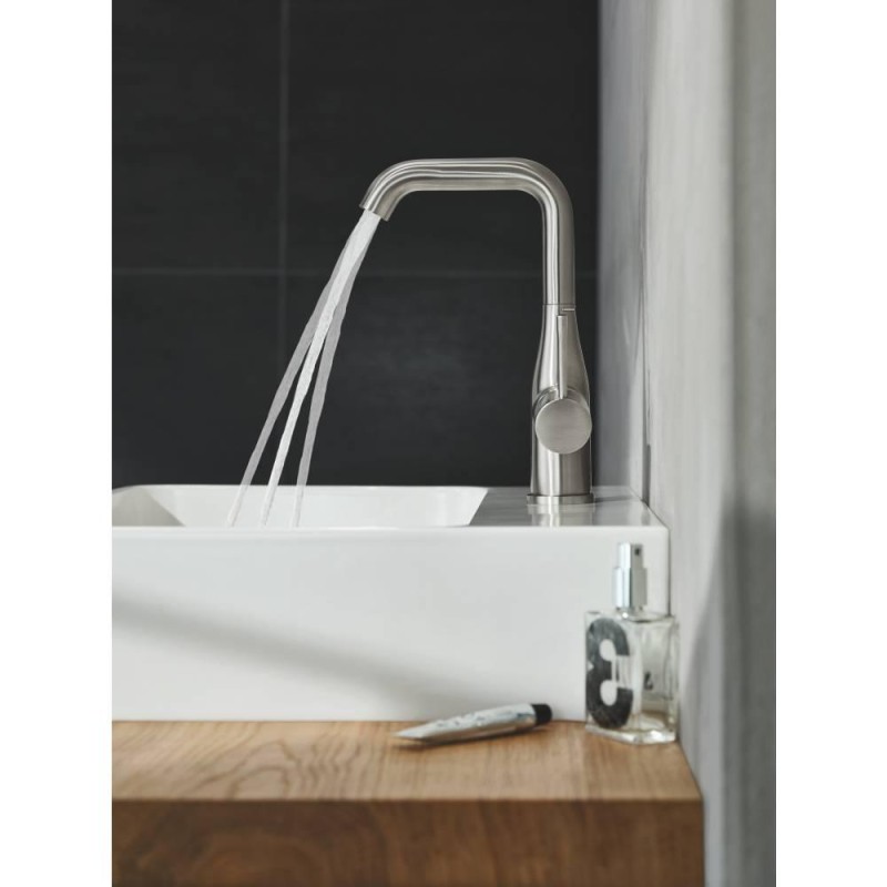 Створений з видатним високим виливом та матовою поверхнею кольору "дамаська сталь", цей змішувач GROHE Essence для раковини з донним клапаном відмінно підійде до інтер'єру будь-якої сучасної ванної.