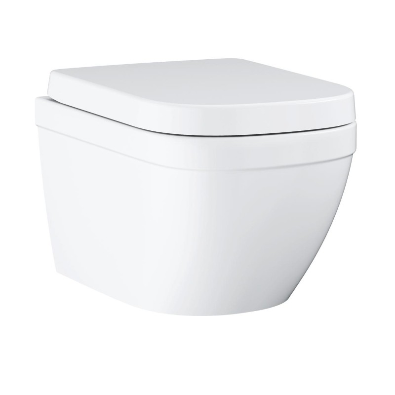 Підвісний унітаз GROHE Euro Ceramic, що поєднує в собі практичність та стиль, ідеально підходить для сучасних ванних кімнат. Унітаз (розмірами 540 x 374 мм) виконаний за безободковою технологією та виготовлений з гладкої білої порцеляни, що не дає шансу бактеріям.