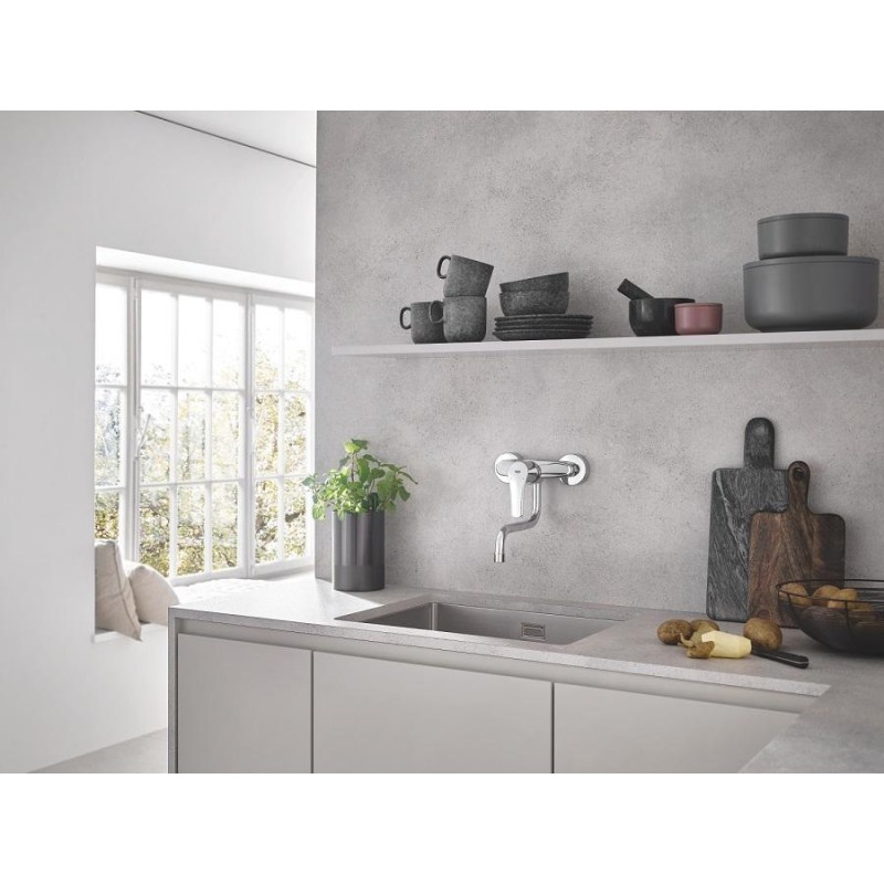 Одноважільний змішувач для мийки настінного зовнішнього монтажу колекції GROHE Eurosmart New, поєднуючи в собі чудову візуальну естетику і бездоганну функціональність, стане ідеальним рішенням для доповнення сучасного кухонного інтер'єру.
