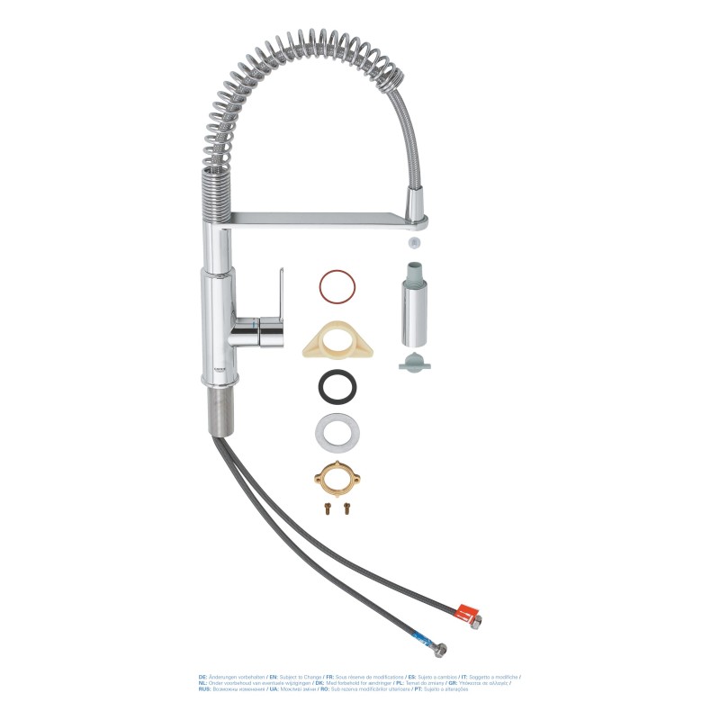 Змішувач має вбудований обмежувач температури. Завдяки системі QuickFix з гнучкими сполучними шлангами змішувач буде встановлений у найкоротший термін. Цей кухонний змішувач з сліпучою, але міцною хромованою обробкою GROHE Long-Life Shine збереже початковий вигляд на довгі роки.