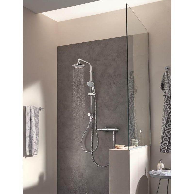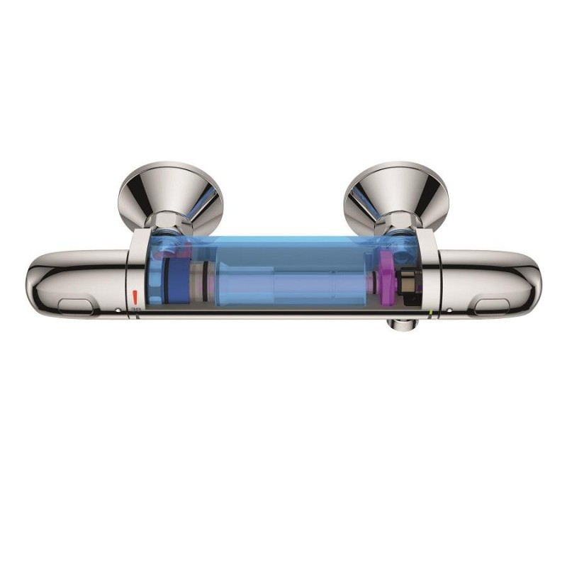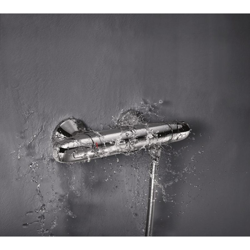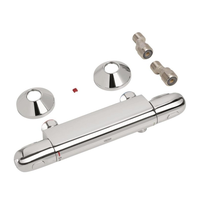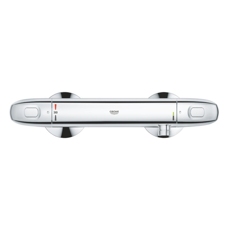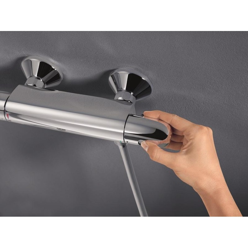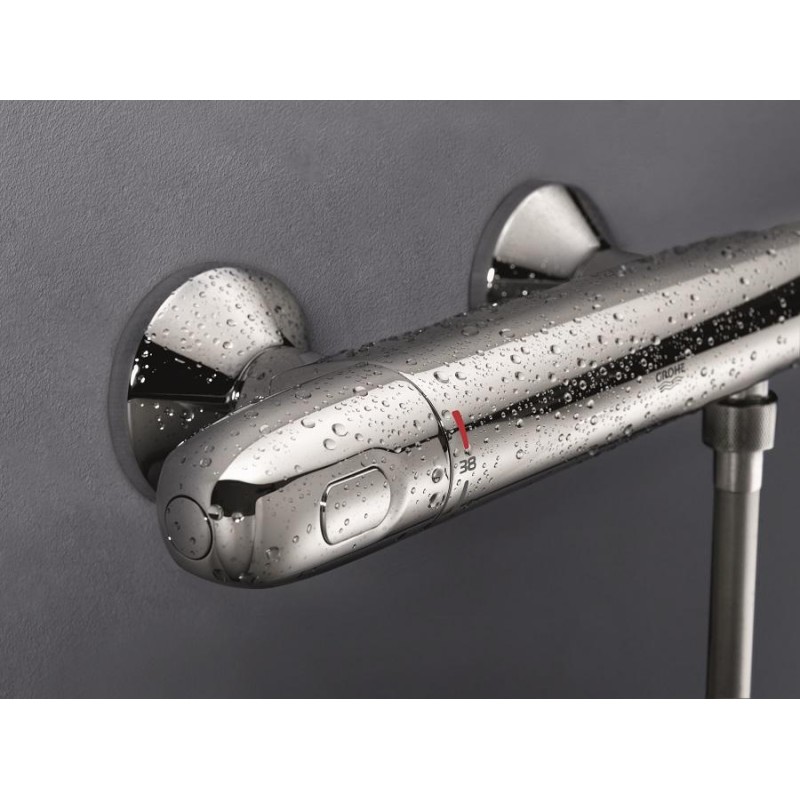 Завдяки GROHE CoolTouch корпус термостату також не перегрівається. Щоб зробити свій внесок у захист навколишнього середовища, вбудована кнопка GROHE EcoButton дозволяє приймати душ із меншою витратою води. Цей термостат із сліпучою хромованою обробкою GROHE Long-Life Shine та ергономічними металевими ручками стане естетичним акцентом вашої ванної кімнати. Встановлення нового термостату виконується швидко та без проблем.