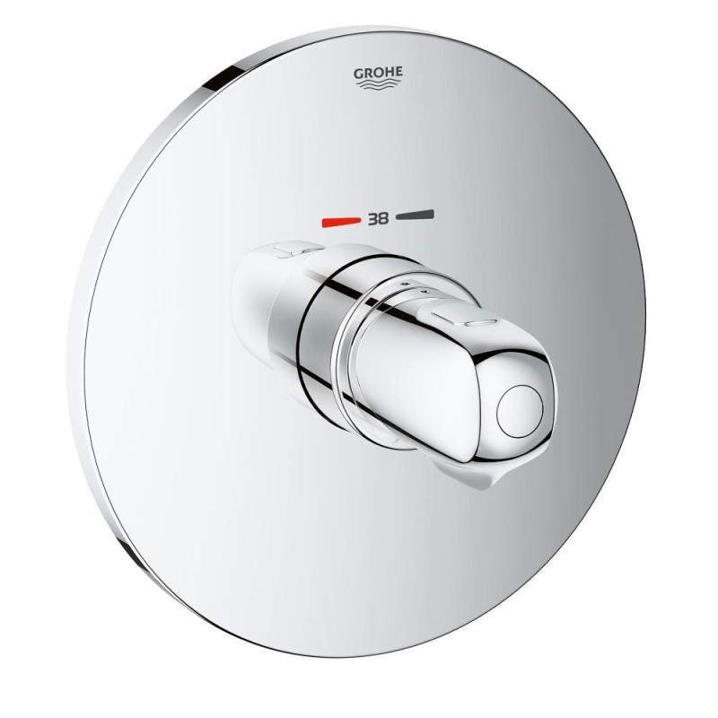 Цей комплект для регулювання температури випускається з глянцевим хромованим покриттям GROHE Long-Life Shine, передбачає настінний монтаж і комплектується відповідним вбудовуваним блоком. Рукоятка виготовлена ??з високоякісного сплаву і легко управляється навіть намиленими руками, а система SafeStop, що обмежує збільшення температури на позначці 38 ° C, захищає дітей і дорослих від опіку. При бажанні можна встановити більш високу температуру, розблокувавши стопор SafeStop. Технологія GROHE TurboStat забезпечує підтримання температури води на постійному рівні. Система монтажу GROHE QuickFix робить даний пристрій зручним для користувачів вже на етапі установки: панель зовнішньої частини легко кріпиться до стіни за допомогою защипувалися механізму. Для перемикання між випуском для ванни і душем Вам потрібно встановити відповідний комплект зовнішньої частини з регулятором для вбудованих вентилів (19981000).