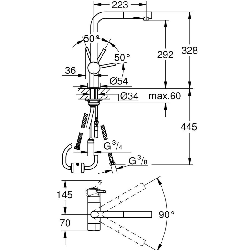 зона повороту виливу 90 °