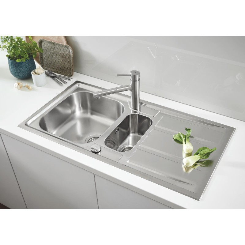 Мийка оснащена рядом розумних характеристик: наприклад, ізоляція GROHE Whisper на нижній частині мийки зменшує шум, а автоматичний сміттєзбірник з дистанційним управлінням означає, що ви можете відкрити клапан основної чаші, не опускаючи свою руку в брудну воду.