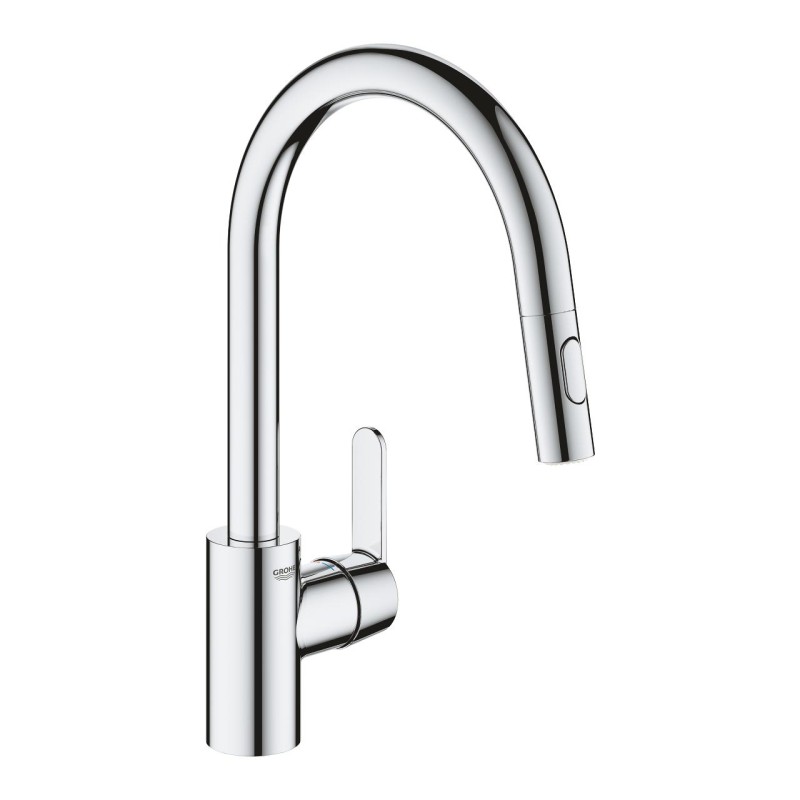 GROHE QuickFix Get Одноважільний змішувач з високим поворотним виливом в поєднанні з висувним однорежимним аератором, дозволять Вам без зусиль виконувати всі повсякденні побутові кухонні завдання. Висувний аератор розширює зону використання змішувача вдвічі, а противага, встановлена на шлангу, що проходить через корпус виливу, допоможе аератору повернутися на місце. Це технологія GROHE EasyDock.