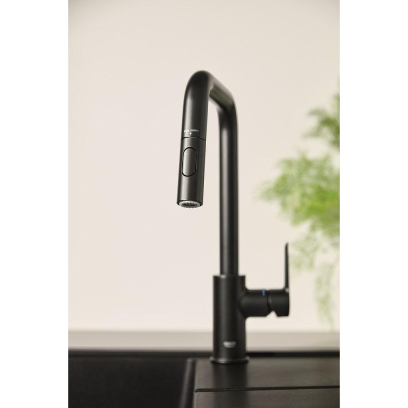 Новий стильний одноважільний змішувач Grohe Start матового чорного кольору з висувним аератором з функцією подвійного розпилення – де легке встановлення поєднується з чудовою ефективністю!