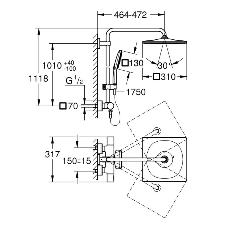 Диаметр верхнього душу квадрат 310 х 310 мм