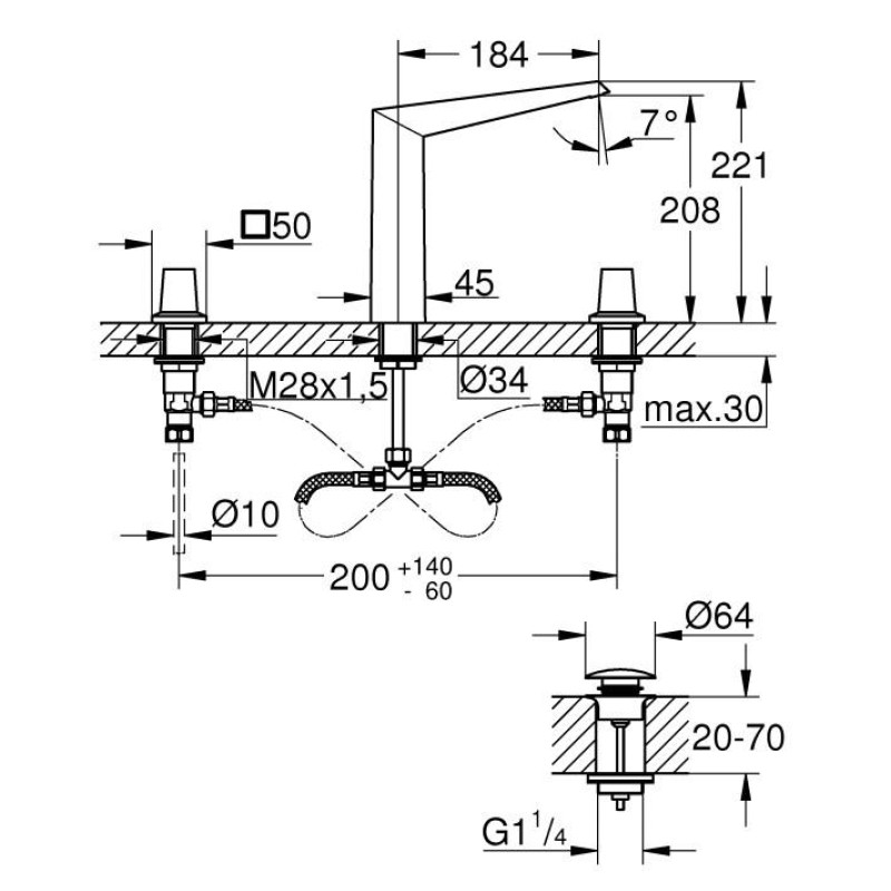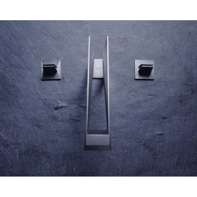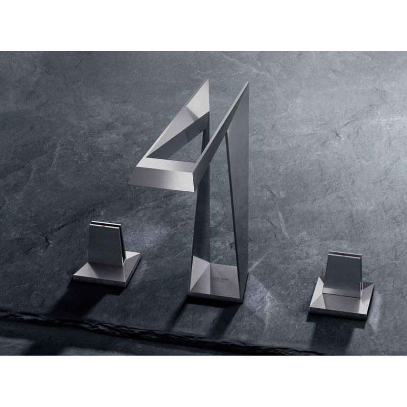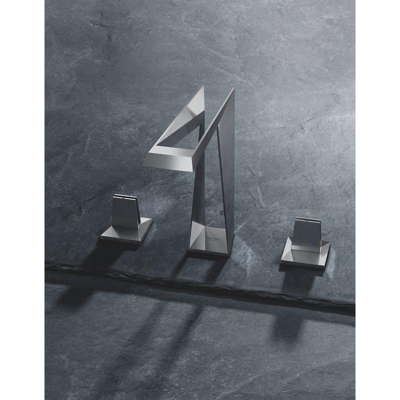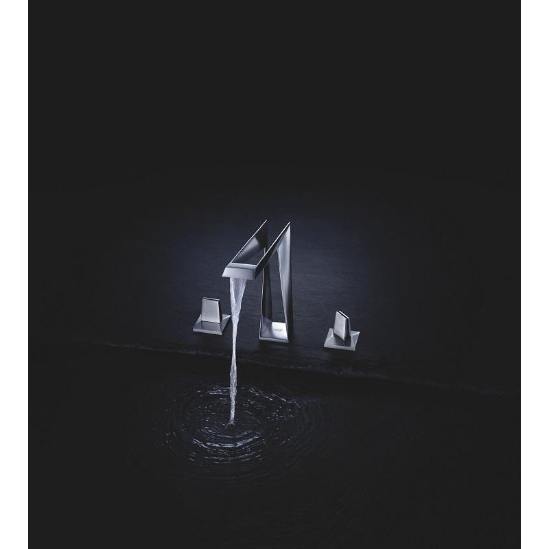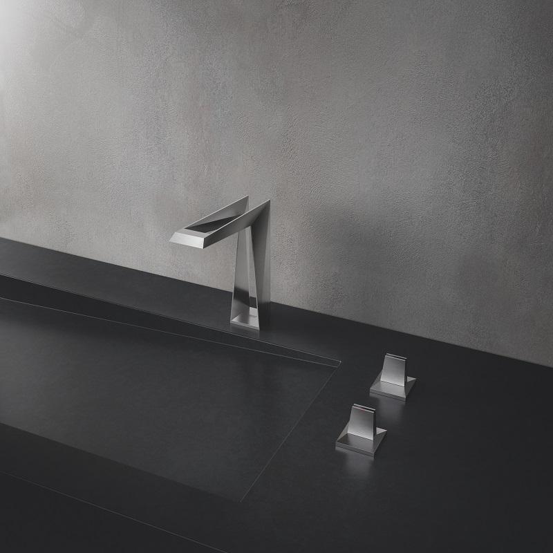 Змішувач для раковини GROHE Allure Brilliant з трьома установочними отворами, встановлений на стільниці, володіє чіткою, гранованою формою, яка підкреслює його архітектурну привабливість.