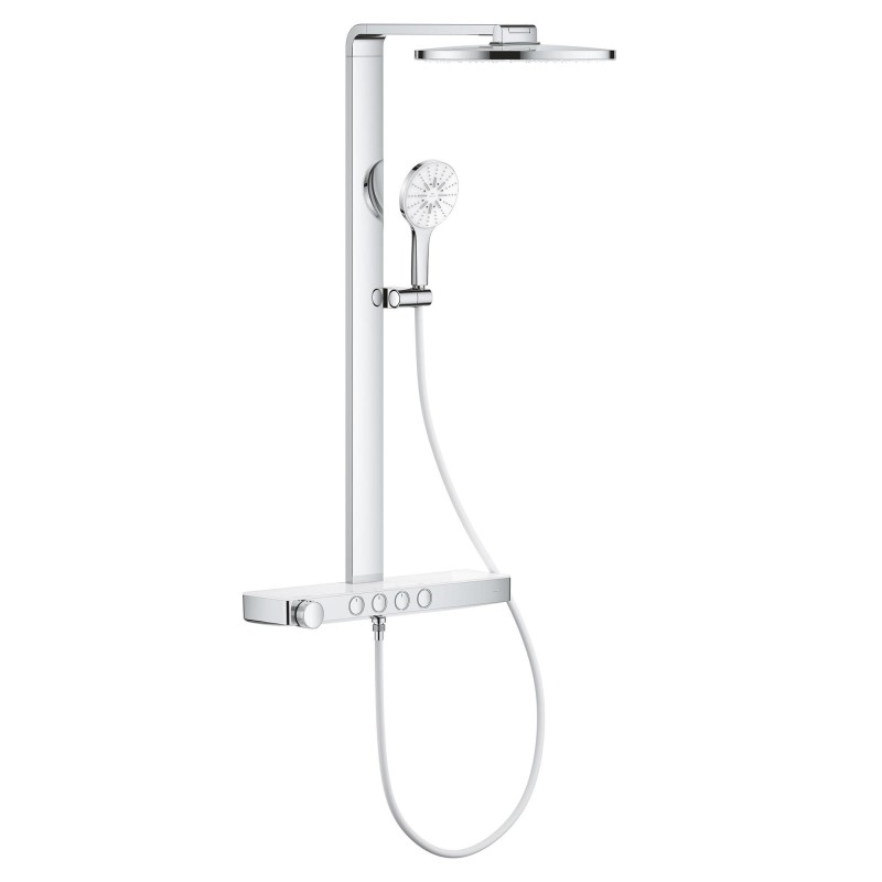 Ручний душ діаметром 130 мм також оснащений білою акриловою поверхнею з трьома видами розпилення: м'яким Rain, об'ємним і наповненим повітрям Rain+ та підбадьорливим ActiveMassage, а додатковий блок GROHE Rainshower Aqua Pure (1016729990) видаляє хлор і неприємні запахи, забезпечуючи насолоду від справді чистої та прозорої води. Він також екологічний: споживання води зменшено до макс. 8,7 л/хв (при тиску 3 бар) для верхнього душу та 8,4 л/хв (при тиску 3 бар) для ручного душу, без шкоди для задоволення.
