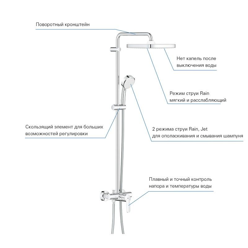 | Додаткові функції | DripStop, поворотний кронштейн верхнього душу, регулювання ручного душу по висоті |