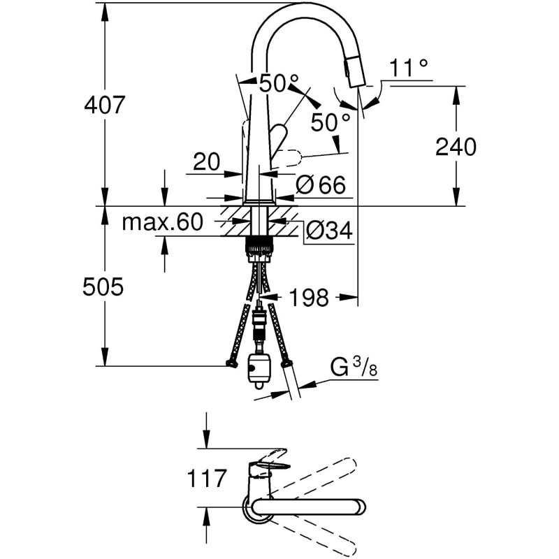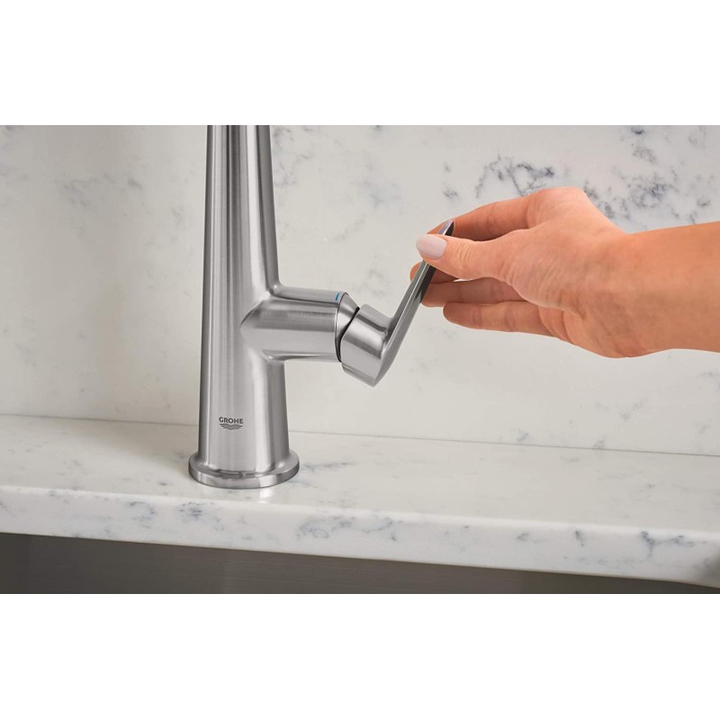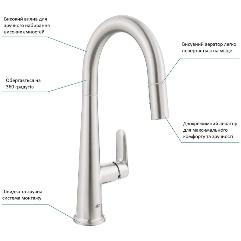Розпилювальна головка з висуванням дозволяє легко перемикатися між аерованим потоком для регулярного промивання і функцією інтенсивного розпилення для інтенсивного очищення. Розпилювальна головка оснащена форсунками GROHE SpeedClean, для видалення накипу і підтримки оптимального функціонування змішувача досить швидко протерти рукою або тканиною.