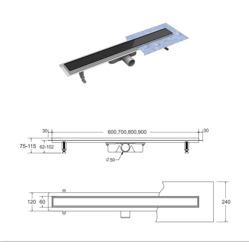 Virgo Black з накладкою з гартованого скла чорного кольору. Сифон з виходом Ø50мм в бік. Пропускна здатність 56л/хв. Розмір 90x6 см