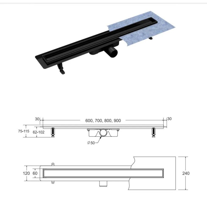 Virgo Duo має основу з нержавіючої сталі. Накладка двостороння в чорному кольорі, з можливістю укладки плитки, також виготовлена з нержавіючої сталі. Сифон з виходом Ø50мм в бік. Пропускна здатність 56л/хв. Розмір 60x6 см