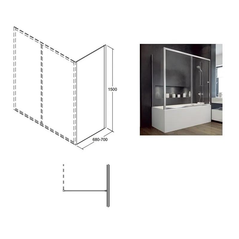 Гартоване скло 6 мм. Вирівнювання нерівностей стін: 68 - 70 см. Висота 150 см, ширина 70 см