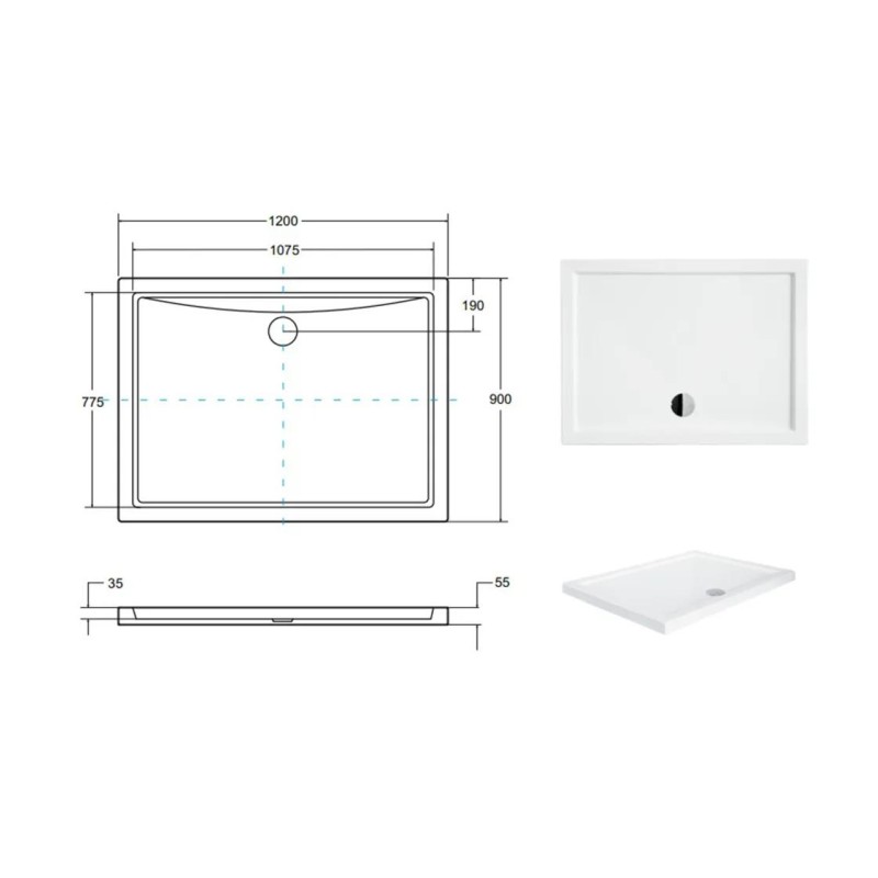 Довжина піддона 1200 мм, ширина - 900 мм, висота - 55 мм, глибина - 30 мм, а діаметр отвору для зливу - 90 мм.