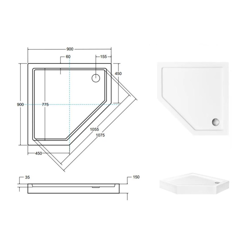 Піддон п'ятикутний з інтегрованою обудовою, глибина піддона 3,5 см