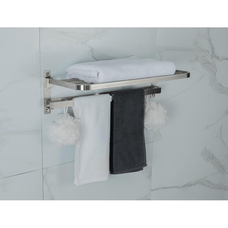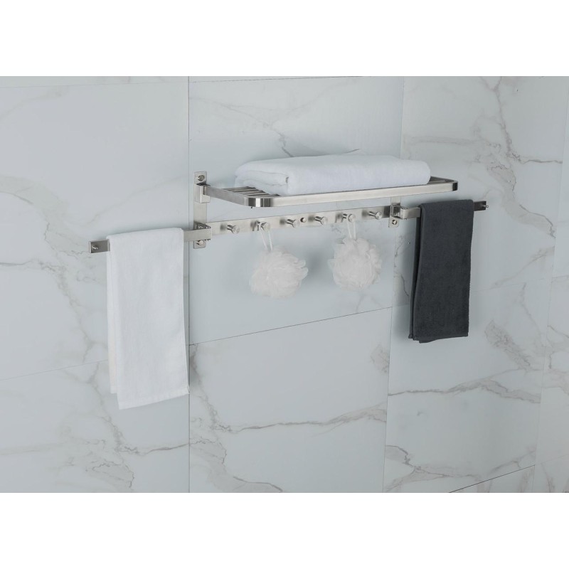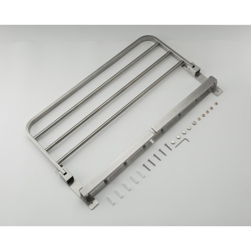 Складна полиця для рушників Frap F30424 є багатофункціональною. Великий, але не займає дуже багато місця. На шести гачках крім рушників можна розмістити й інше приладдя для лазні. Виготовлено полицю з нержавіючої сталі. У разі постійної вологості не втратить зовнішній вигляд. Дуже міцна, зможе витримати великі навантаження. До стіни кріпиться на саморізи та дюбелі, вони йдуть у комплекті.