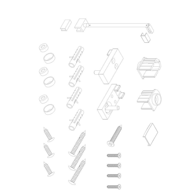 Комплектація Упаковка 1/1. Профілі, опорна планка, фіксована та поворотна скляна панель, комплект кріплень, набір ущільнювачів, заглушки.