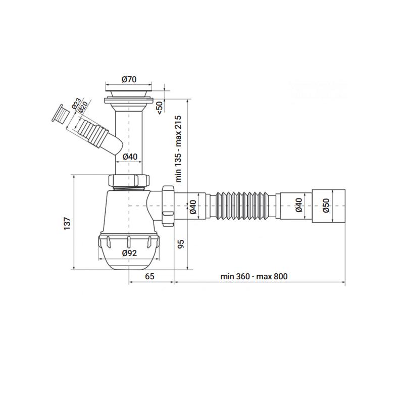 | Особливості | Гідрозатвор 50 мм; Відвідна гнучка трубка до каналізації завдовжки 360-800 мм; Діаметр трубки для підключення до каналізації 40/50 мм; Зовнішній діаметр відведення під пральну машину 23/20 мм. |