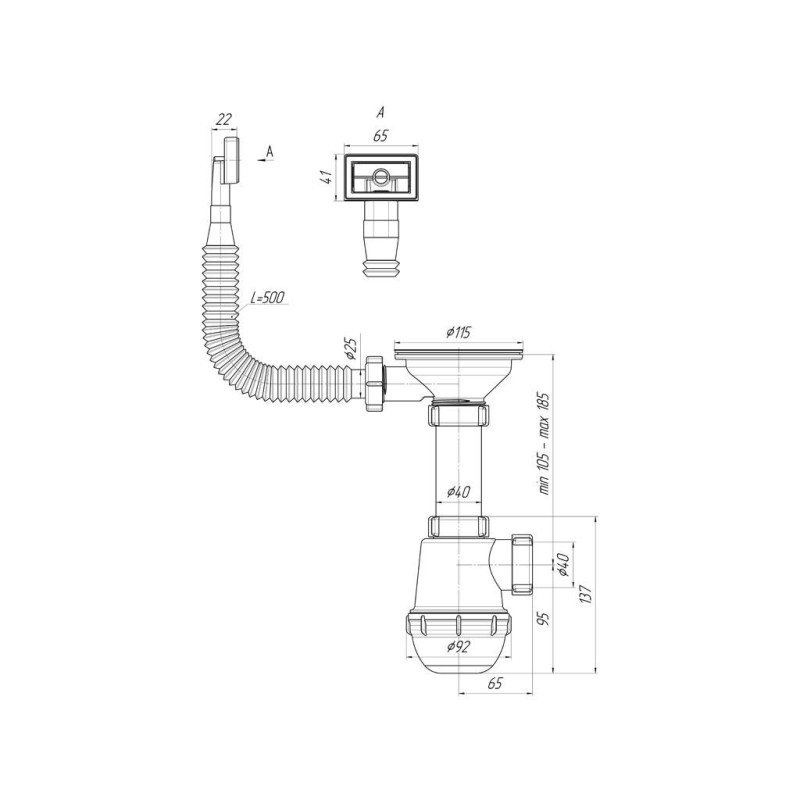Сифон для кухонної мийки ANI-plast A0145S, 3 1/2" x 40 з гнучким переливом, без випуску