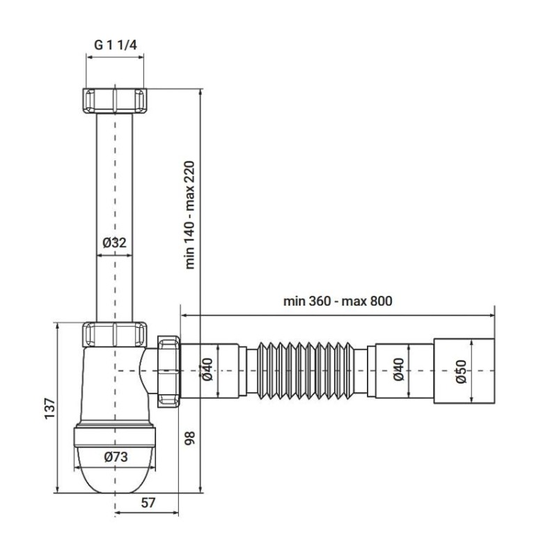 Відвідна гнучка трубка до каналізації завдовжки 360-800 мм; Діаметр трубки для підключення до каналізації 40/50 мм.