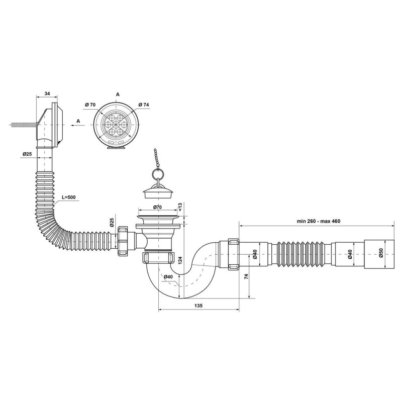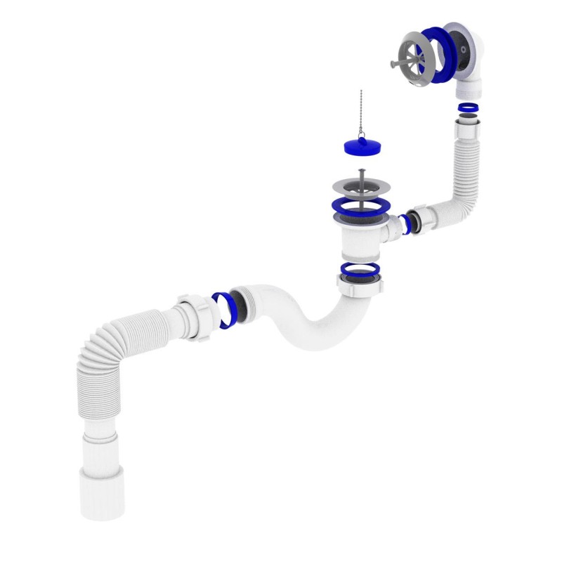 прямоточний 1 1/2"*40 з різьбовим випуском 1 1/2" з нержавіючою сіткою діаметром 70 мм і пробкою, а токож з перлівом з нержавіючою сіткою, комплектується нержавіючїм ланцюжком з кільцями з нержавіючої сталі. Для підключення до каналізації комплектується гнучкою трубою 40*40/50