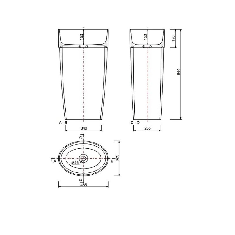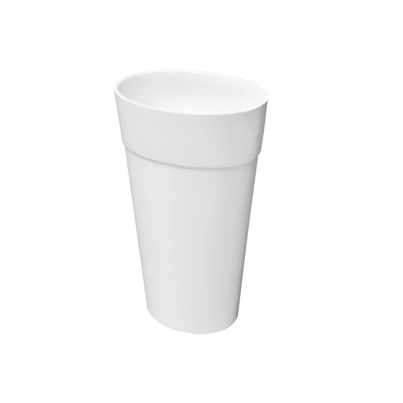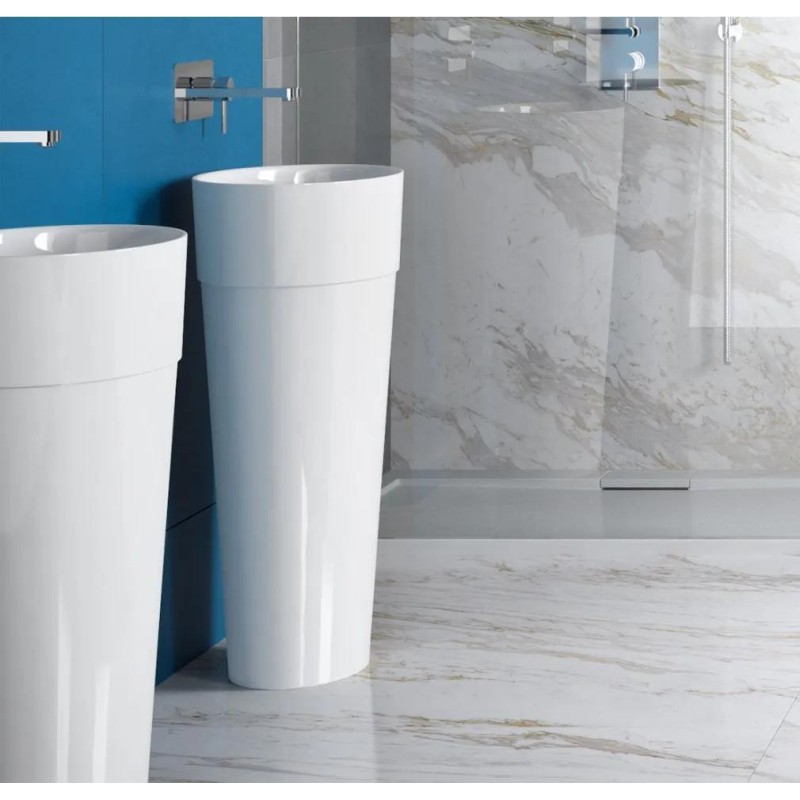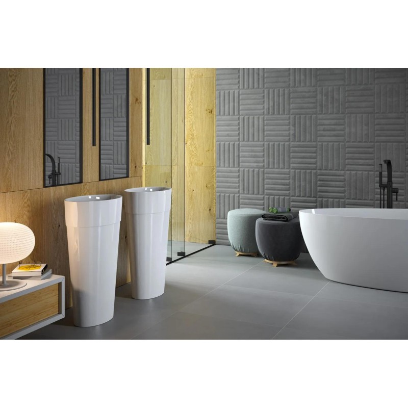 Умивальник підлоговий овальної форми в білому матовому кольорі зовні, глянцевий всередині. Виготовлений за технологією Mineral DuraBe - мінеральне лиття, яке є сумішшю натуральних каменів (таких як мармур або граніт) і смоли, характеризуються ідеально гладкою, непористою поверхнею з дуже високою міцністю та стійкістю до зміни кольору.