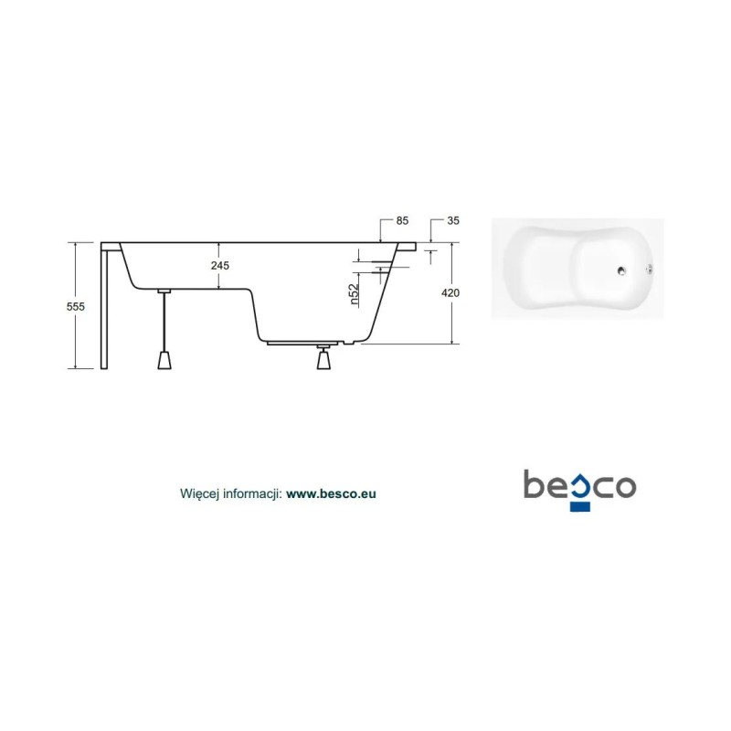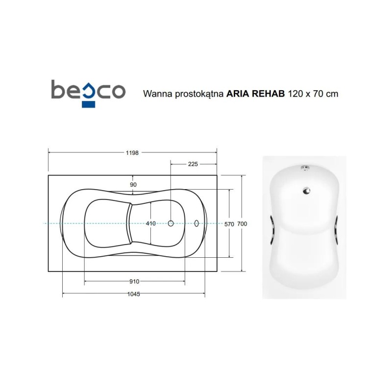 Ванна акрилова ARIA REHAB 120х70 без обудови і ніг/БЕЗ отворів під ручки