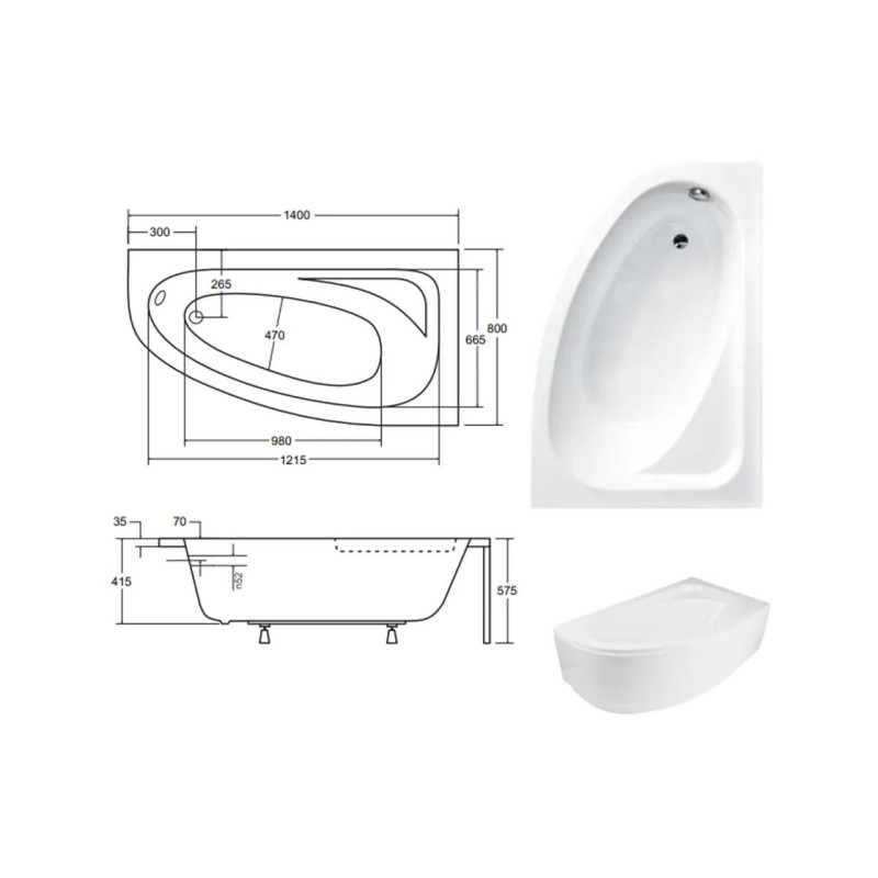 Ванна акрилова CORNEA 140х80 Права (соло) без ніг