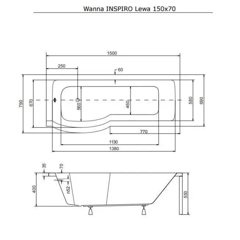 Ванна акрилова INSPIRO 150х70 Ліва (соло) без ніг