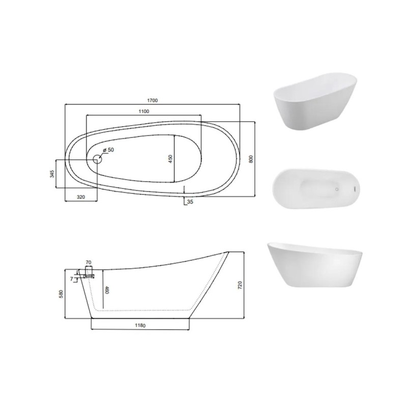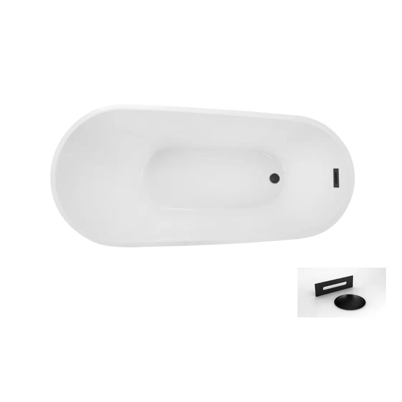 Ванна акрилова вільностояча білого кольору. Об'єм ванни: 250 л. Комплектується сифоном клік-клак чорного кольору з тонким прямокутним переливом.