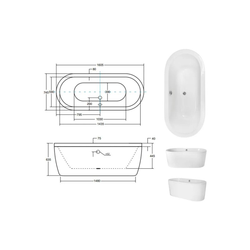 Ванна вільностояча біла з сифоном Alcaplast з тонким переливом з верхньою очисткою хром.