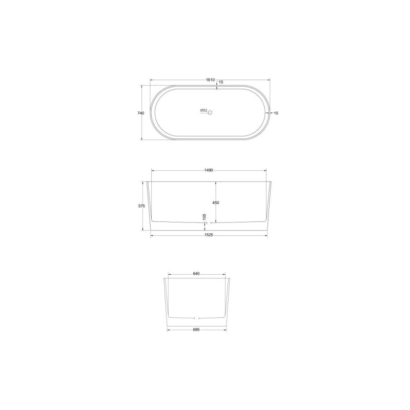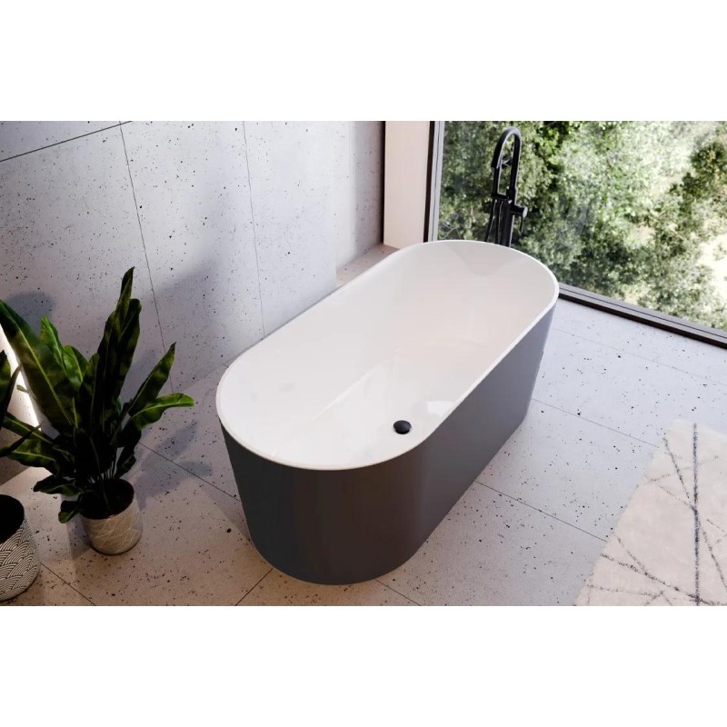Ванна вільностояча, зовні в кольорі gun metal matt (сірий матовий), зсередини біла глянцева, з сифоном клік-клак з верхньою очисткою в кольорі чорний матовий.