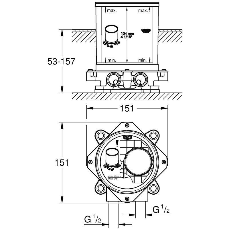 | Особливості | Для змішувачів та виливів. Для ванни монтажу. Без комплекту верхньої монтажної частини. Допускається регулювання 360° у горизонтальній площині та 3° у вертикальній площині. Монтажна глибина 53-157 мм., компенсація глибини 104 мм., два входи |