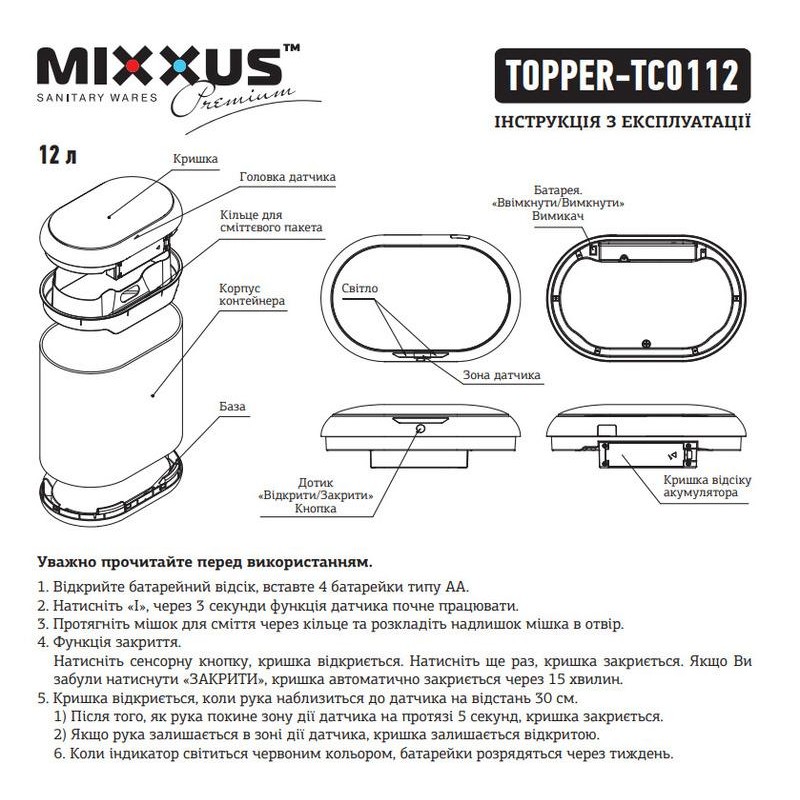 Відро для сміття сенсорне овальне MIXXUS PREMIUM модель TOPPER-TC0112 WHITE має розмір 352x315x200 мм. Відро для сміття виготовлено з високоякісної нержавіючої сталі. Об'єм виробу становить 12 л. Має глянцеву білу поверхню Для керування перемикачем кришки у цьому приладі використовується інфрачервоний датчик руху. Кришка відкриється, коли руки або предмети потраплять в зону індукції; кришка буде залишатися відкритою, доки руки або предмети залишаються в зоні індукції; кришка закриється протягом кількох секунд після того, коли руки або предмети залишать зону індукції.